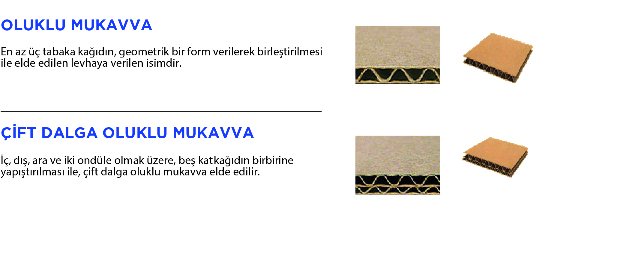 Oluklu mukavvanın, tasarıma özel kalıplarda işlenmesi ile üretilir. İstenen her ölçü, şekil ve kalitede ambalaj geliştirilebilir. Farklı baskı teknikleri ile marka iletişiminde önemli rol oynar. Bu nedenle perakendeden e-ticarete, tüketimden, yiyeceğe çok geniş bir kullanım alanına hitap eder.